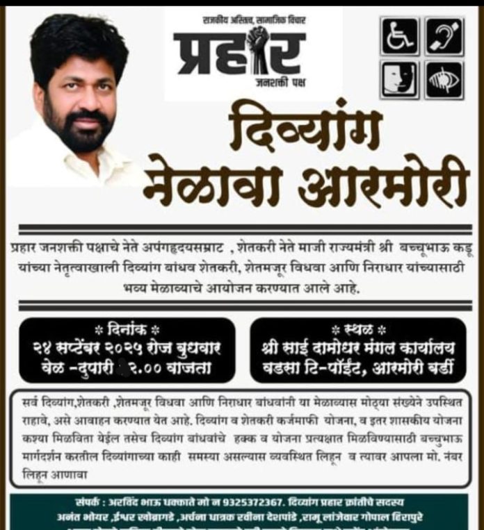 आरमोरीत २४ सप्टेंबरला दिव्यांग मेळाव्यात उपस्थित राहणार प्रहारचे बच्चूभाऊ कडू