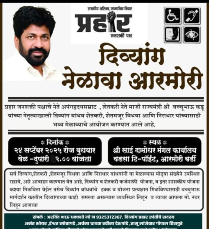 प्रहार जनशक्ती पार्टीचे जिल्हा प्रमुख निखिल धार्मिक तसेच दिव्यांग सेलचे अरविंद धकाते,अनंत भोयर यांनी केले आहे.
