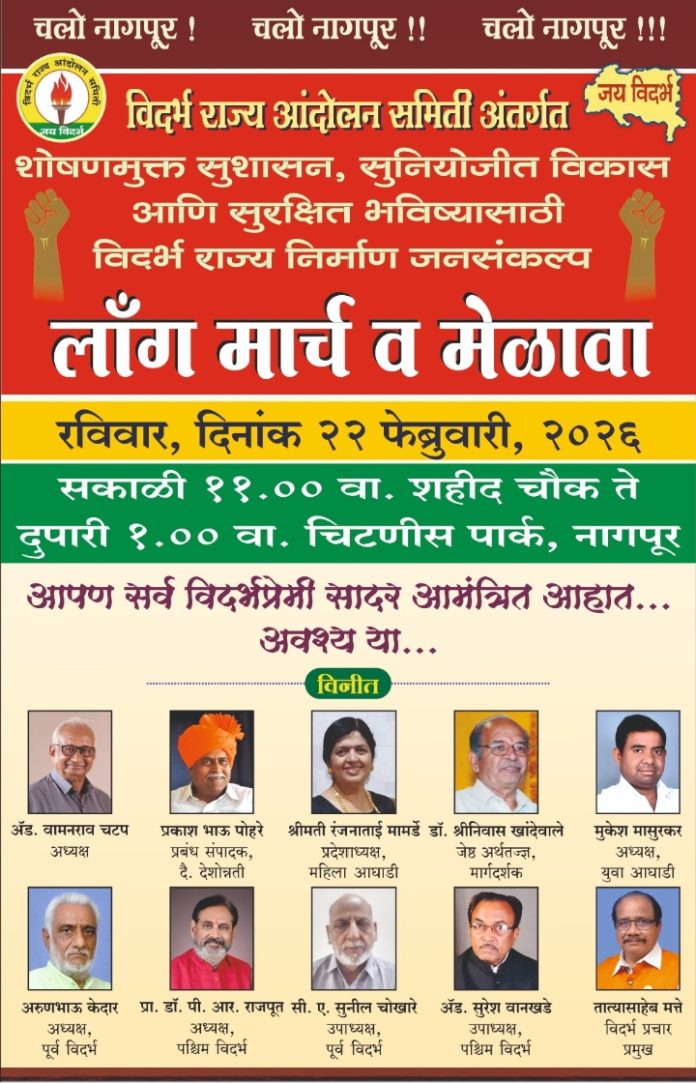 गडचिरोली/नागपूर,दि.१९:विदर्भ राज्य आंदोलन समिती च्या वतीने स्वतंत्र विदर्भ राज्याच्या निर्मिती करीता रविवार, दिनांक 22 फेब्रुवारी 2026 रोजी, दुपारी 12 वाजता विदर्भ चंडिका मंदिर शहीद चौक, इतवारी, नागपूर येथून विदर्भ जनसंकल्प लॉंग मार्च काढण्यात येणार आहे. हा लॉंग मार्च चिटणीस पार्क पर्यंत जाऊन तेथे भव्य मेळावा घेण्यात येणार आहे.