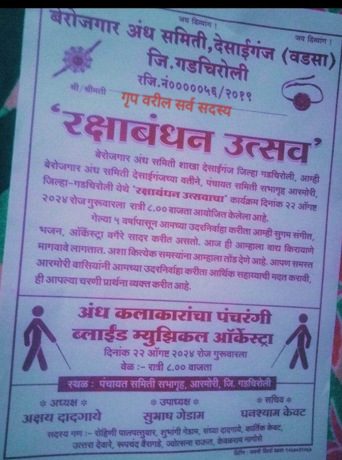आरमोरी (जिल्हा गडचिरोली): दरवर्षीप्रमाणे यंदाही बेरोजगार अंध समिती शाखा देसाईगंजच्या वतीने सर्वत्र सुरू असलेल्या रक्षाबंधन उत्सवाच्या पावन पर्वावर पंचायत समिती सभागृह आरमोरी येथे आज दिनांक २२ आॅगस्ट २०२४ रोजी रात्री ८ वाजता ‘अंध कलाकारांचा पंचरंगी ब्लाईंड म्युझिकल आॅर्केष्ट्रा ‘ या कार्यक्रमाचे आयोजन करण्यात आले आहे.