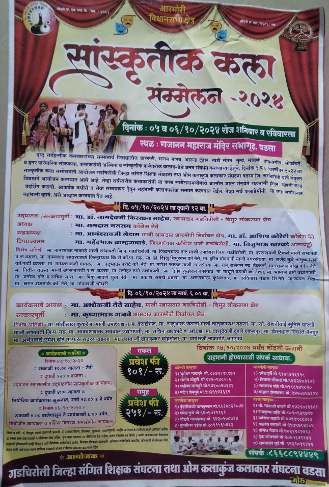 देसाईगंज (वडसा) जिल्हा गडचिरोली,दि.३ आॅक्टोंबर: गडचिरोली जिल्हा संगीत शिक्षक संघटना व ओम कलाकुंज कलाकार संघटना वडसा यांच्या संयुक्त विद्यमाने दिनांक ५ व ६ आॅक्टोंबर 2024 रोज शनिवार व रविवारला गजानन महाराज मंदिर सभागृह वडसा येथे सांस्कृतिक कला संमेलन 2024 चे आयोजन करण्यात आले आहे.