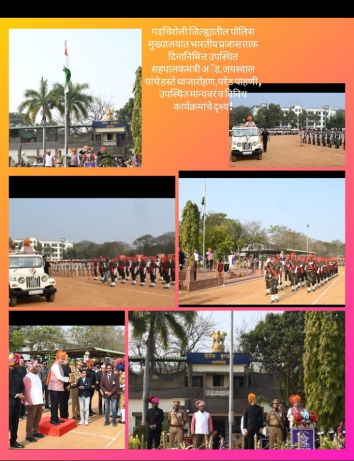 कार्यक्रमाच्या सुरुवातीला सहपालकमंत्र्यांनी परेडचे निरीक्षण केले. सी-60 कमांडो पोलिस दल, स्काऊट गाईड तसेच विविध शैक्षणिक संस्थांच्या पथसंचलनासह प्रात्यक्षिके सादर करण्यात आली. विविध क्षेत्रांत उल्लेखनीय कामगिरी करणाऱ्यांचा गौरव करण्यात आला. एशियन युथ पॅरा गेम्समध्ये धनुविद्या प्रकारात सुवर्णपदक मिळविणान्या कु. स्वेता कोचे हिला 5 लाख 20 हजार रुपयांचे क्रीडा साहित्य सहपालकमंत्री यांच्या हस्ते देण्यात आले, तर एशियन बंॅडमिटन चम्पियनशिपमध्ये सुवर्णपदक मिळविणारे विनय कोवे यांचाही सन्मान करण्यात आला.